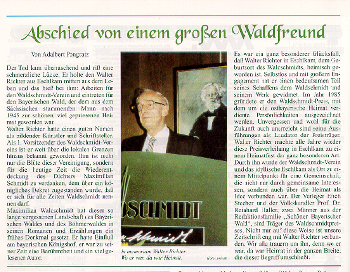 Nicht nur aktive Schriftstellerei machte sich W. Richter zu eigen, sondern auch die Bewunderung für viele unterschiedlichste Arten von Dichtkunst anderer Schriftsteller. Einer von ihnen war Maximilian Schmidt, genannt Waldschmidt, geboren in der Waldheimat.
